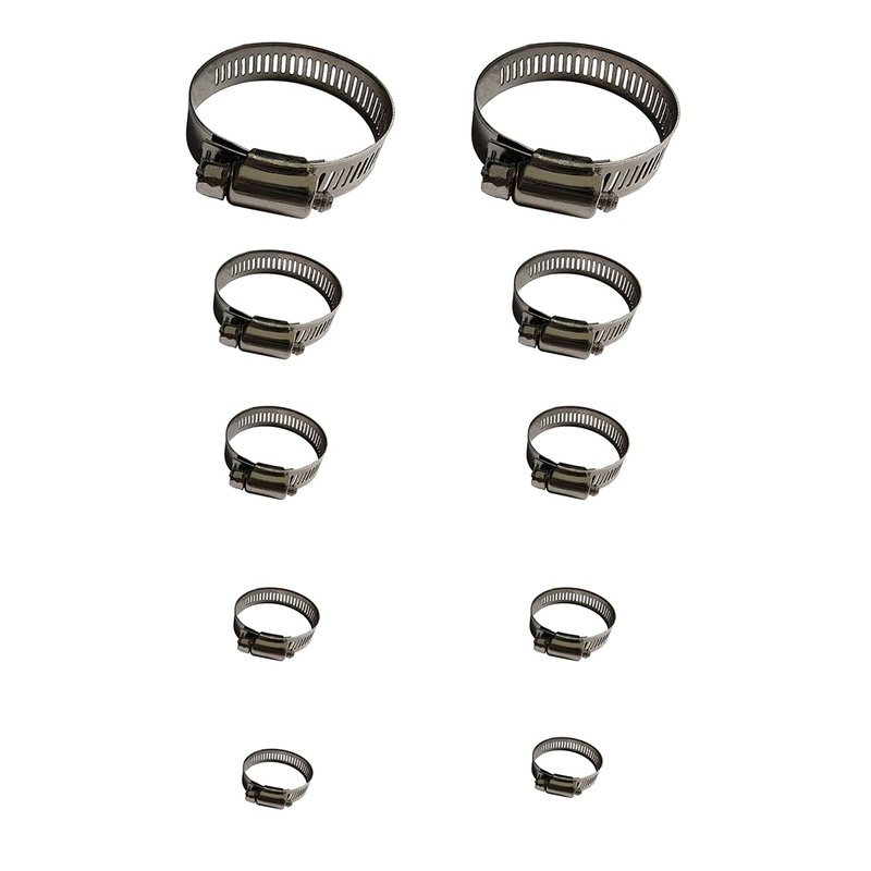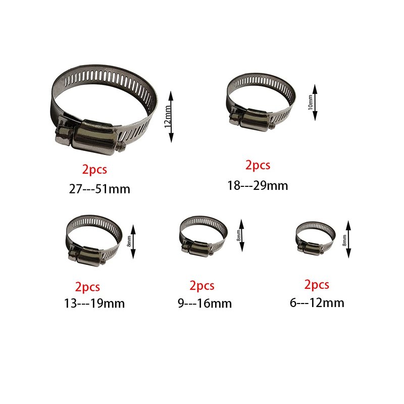 - Size Range-The hose clamp is flexible and extensible, with adjustable width, and the size range is from 6-51mm (1 / 4in-2in). The hose clamp width ranges from 8mm to 12mm, suitable for fixing pipes of various sizes.Fit Hose Diameter: 6-12mm, 9-16mm, 13-19mm,18-29mm, 27-51mm(5 sizes and 10 pcs)Handy and fulfill your multi needs.