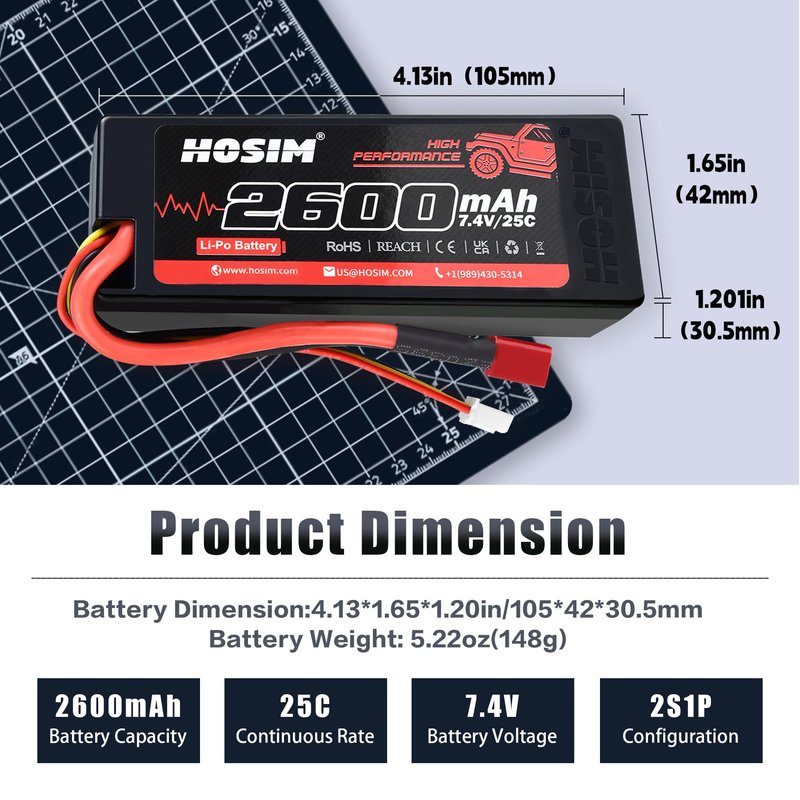 - Battery Voltage: Measuring 4.13in (105mm) in length, 1.65in (42mm) in width, and 1.2in (30.5mm) in height, weight 148g, capacity: 2600mAh, voltage: 7.4V; this battery features a compact and lightweight design that fits seamlessly into your RC vehicle.
