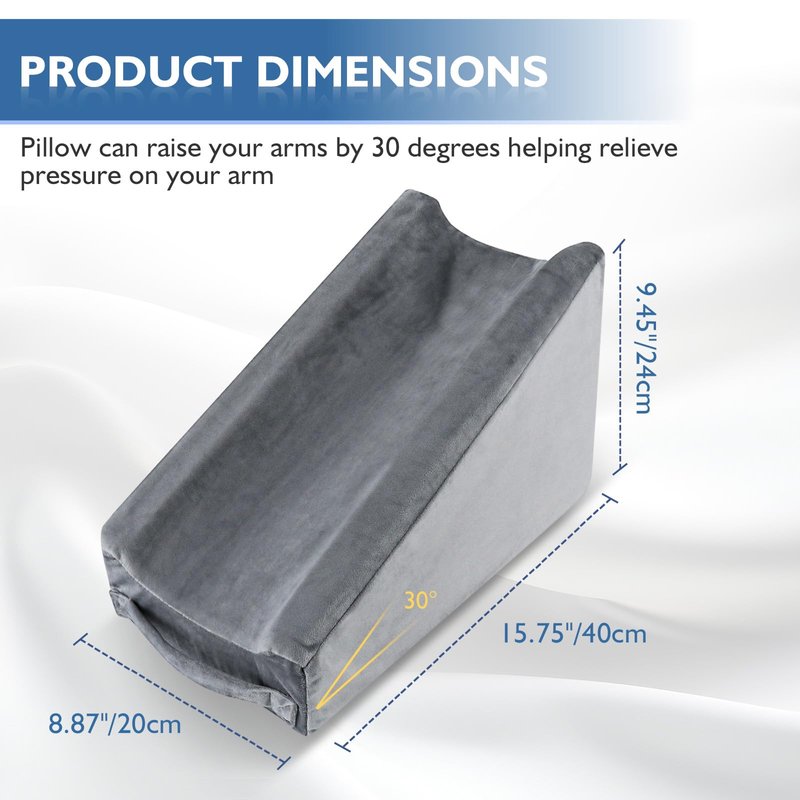 - Size - Measuring 15.57”x 9.4”x 7.9”. It comes with the right height and desirable inclination, keep wedge outlines along the natural curves of arms, takes the excess pressure off your forearm, wrist, and elbow, and provides a comfortable resting place for your arms while you sleep.
