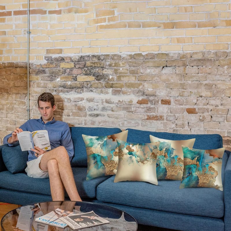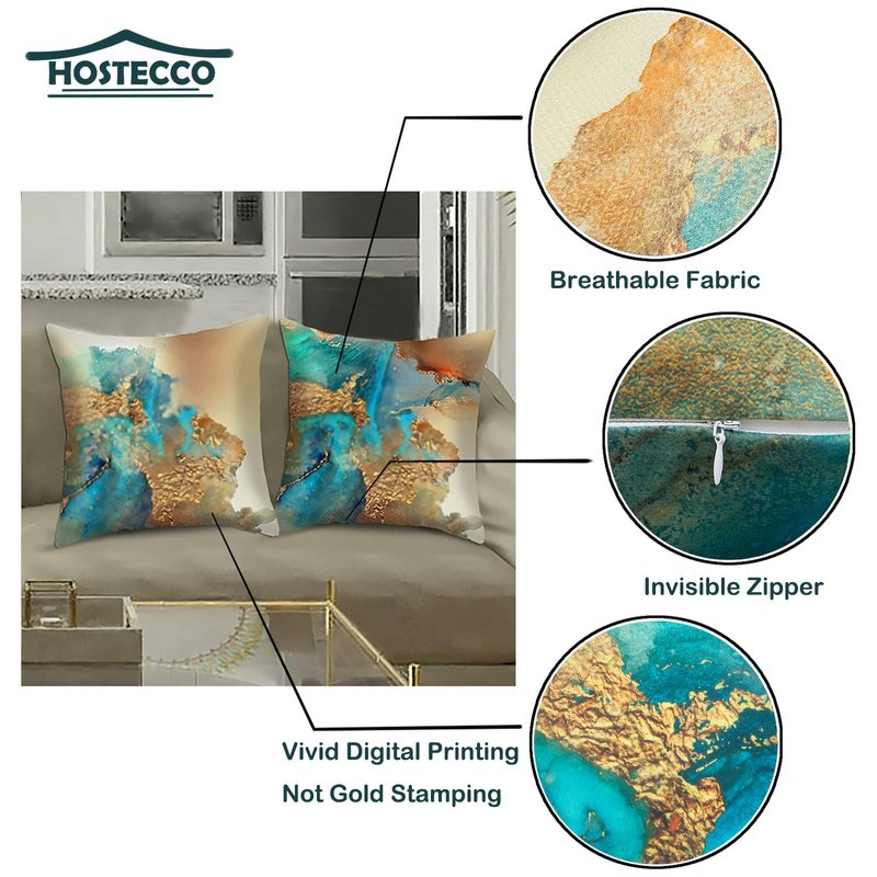 HOSTECCO Gold Abstract Pillow Covers Set of 4 Nordic Blue Pillow Cases Teal and Gold Modern Decorative Cushion Covers for Sofa Couch 18x18 inches