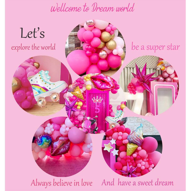 【Hot Pink Gold Balloons Garland Kit】: The 2023 hottest Pink dreamland Balloon Kit, includes 118pcs latex balloon (color in Rose red, Hot pink, Light pink, metallic rose gold, Gold, size in 5inch, 10inch,18inch) with 4pcs princess style foil balloons(1pc Lip shape+1pc ice cream +1pc starburst+ 1pc Roller Skate ) , 3pcs balloon arch accessories. A roll of 16ft tape strip and dot glue provide a perfect DIY balloons pack for any party decorations. Adding sweetie atmosphere to your party.