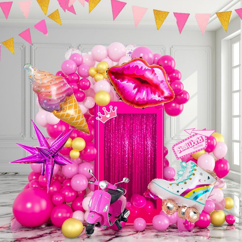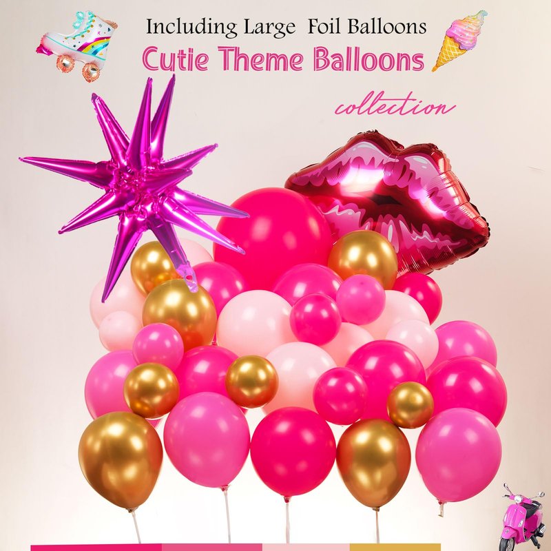 - 【Hot Pink Gold Balloons Garland Kit】The 2023 hottest Pink dreamland Balloon Kit, includes 118pcs latex balloon (color in Rose red, Hot pink, Light pink, metallic rose gold, Gold, size in 5inch, 10inch,18inch) with 4pcs princess style foil balloons(1pc Lip shape+1pc ice cream +1pc starburst+ 1pc Roller Skate ) , 3pcs balloon arch accessories. A roll of 16ft tape strip and dot glue provide a perfect DIY balloons pack for any party decorations. Adding sweetie atmosphere to your party.