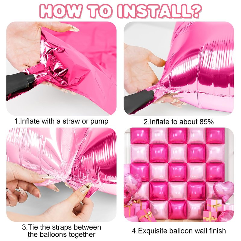 - Widely Applications:Hot pink square foil balloon wall can be placed indoors or outdoors and can be paired with rubber balloons in the same color to create a quick party atmosphere.Suitable for birthday, anniversary,bachelorette,weddings,openings,disco party,baby shower,engagement,bridal shower,etc. as party decorations.