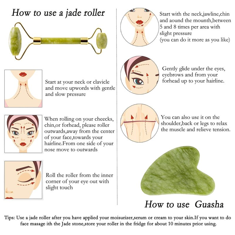 - ✅Tips: You can keep the facial jade roller in the fridge and it helps to eradicate morning puffiness and get the skin refreshed.