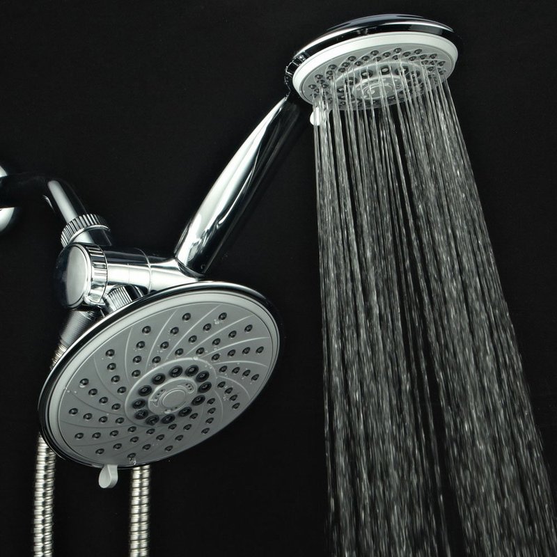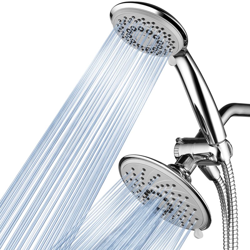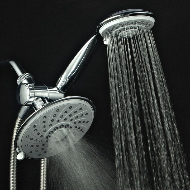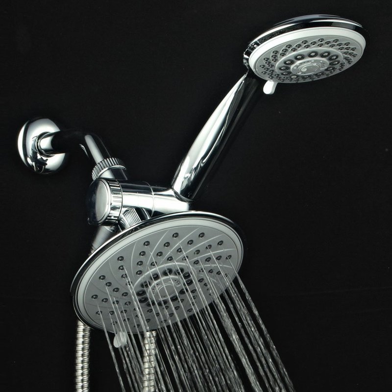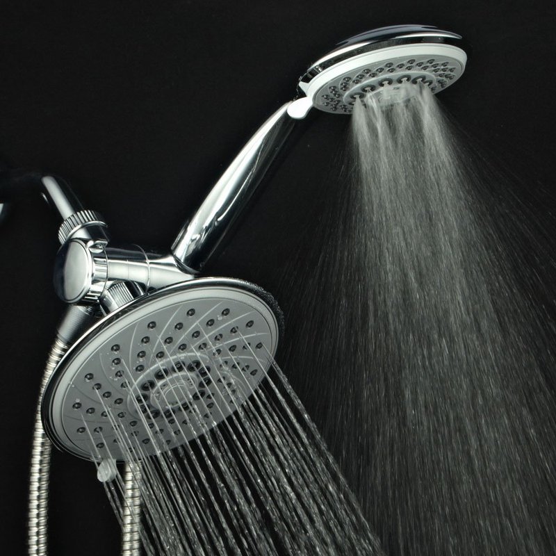 - Dual Shower Head System Includes a 6-setting 6 inch Rain Shower Head | 6-setting 4 inch Handheld Shower | Patented 3-way Water Diverter with Anti-swivel Lock Nut | Angle-adjustable Overhead Bracket | 5 Foot Stainless Steel Shower Hose and Plumber's Tape.
