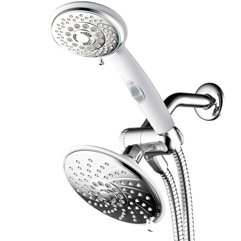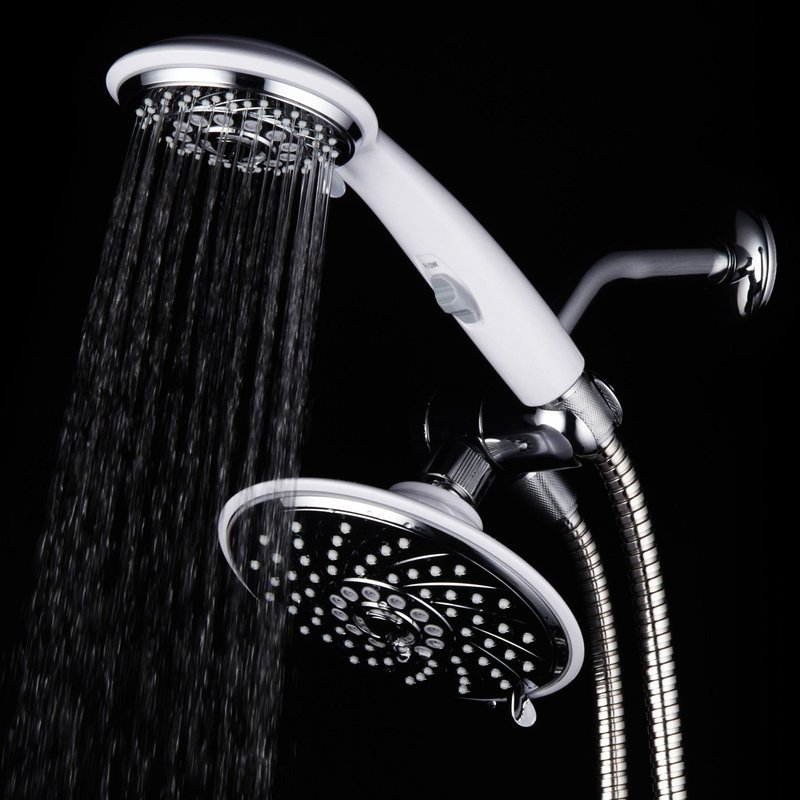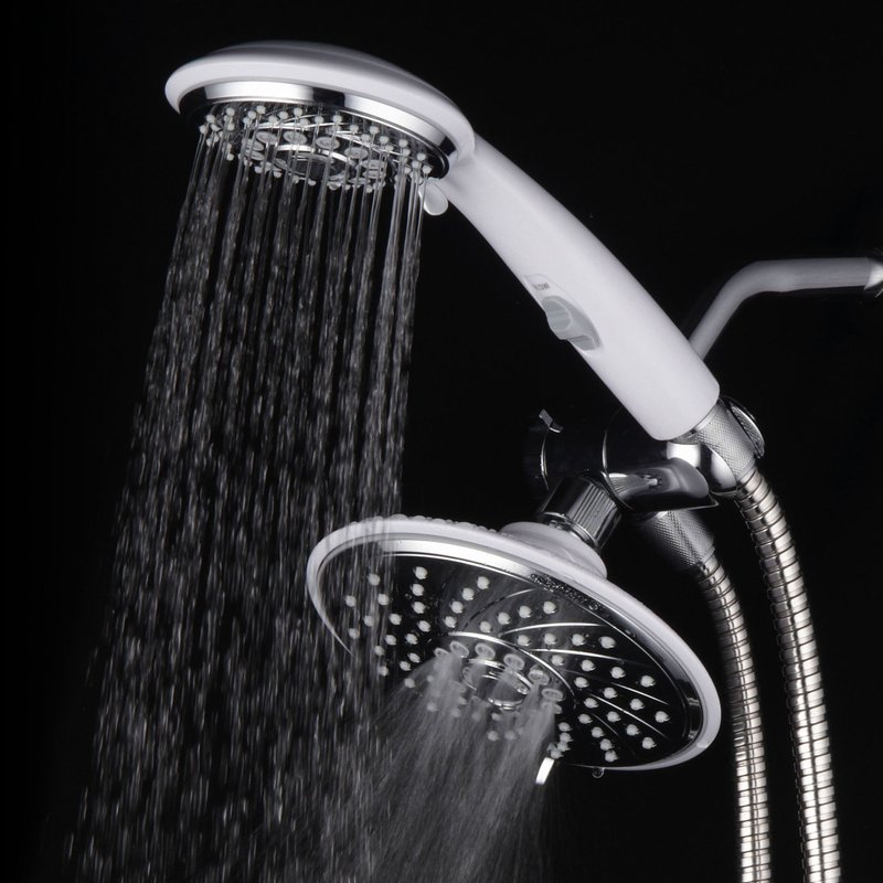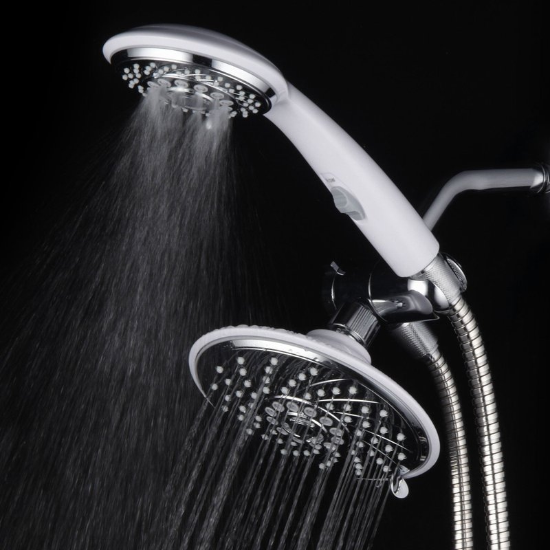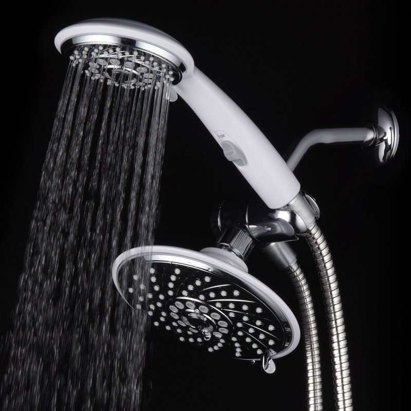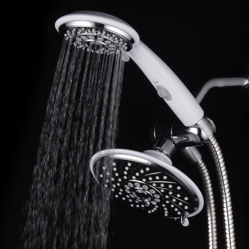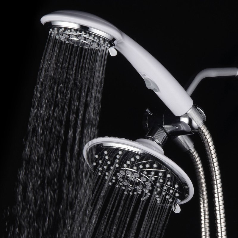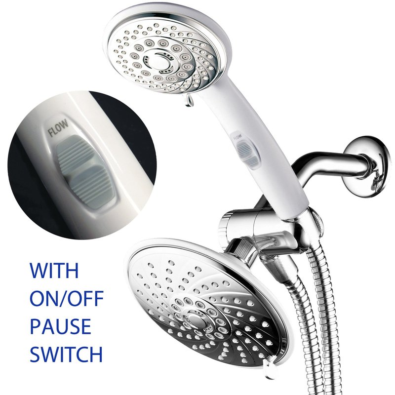 - HotelSpa Designer 2-Tone Chrome / White Finish 30-Setting Ultra-Luxury 3-way Rainfall/Handheld Shower with Switch Combo - Use two Showers Heads separately or use Showerhead and Hand Held Shower with Patented On/Off Pause-Switch both together for a choice of 30 full and combined water flow patterns