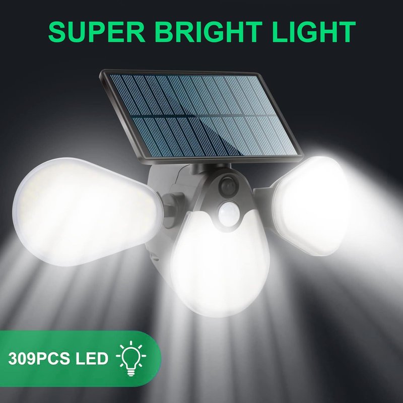 Solar Motion Sensor Lights, Solar Lights Outdoor with 309 LED IP65 Waterproof Wall Lights with 3 Heads Wide Angle Flood Security Light for Garage Yard Patio