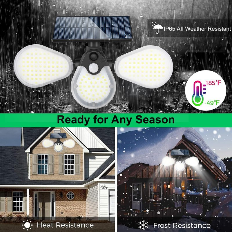 - 【IP65 and Extreme Weather Resistant】Our outdoor lights solar powered are made of durable ABS material and impact-resistant PC lens create a robust housing which can withstand bad weather. IP65 ensures our 3 head security light still work perfectly in rain, frost, sleet or snow weather.