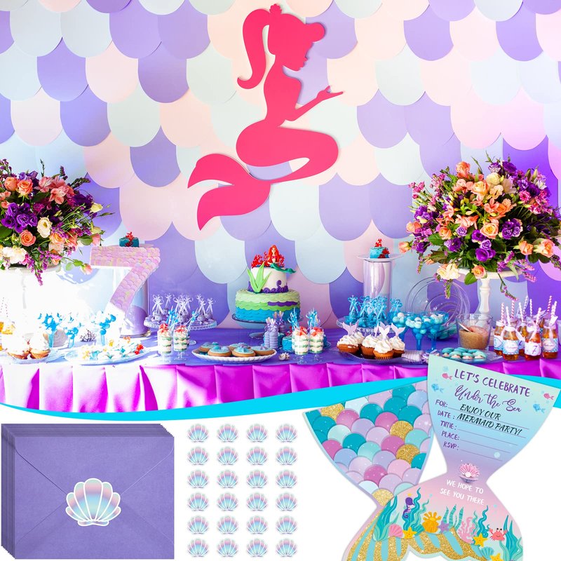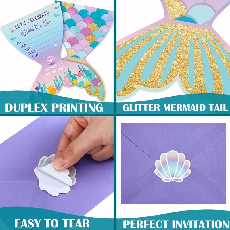 - Mermaid Elements: glitter mermaid invitations and mermaid stickers are printed with exquisite patterns; The envelope is designed in purple color, full of dazzling visual effects; When your friends and family receive the invitations, they will feel the courage and love that you convey