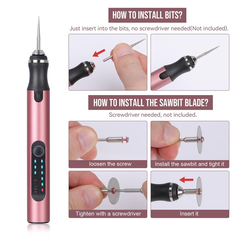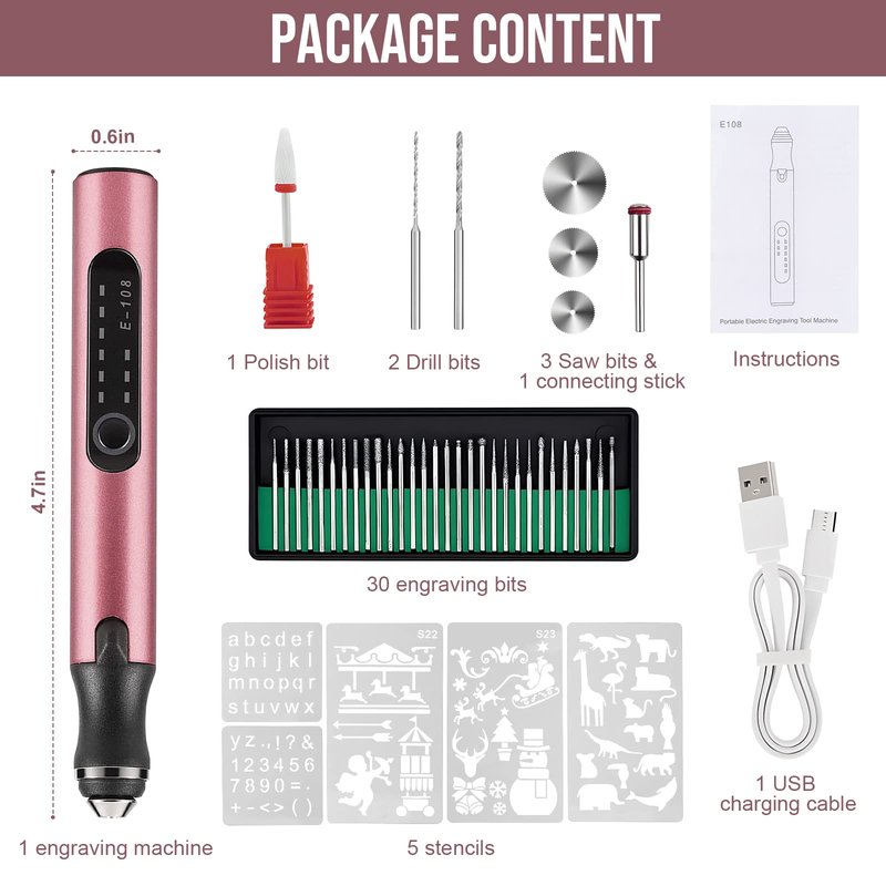 - This engraving machines kits include 30 engraving bits, 3 saw bits, 1 connecting stick, 2 drill bits, 1 polish bit, 5 stencils, and 1 USB charging cable, all these bits are enough to work on engraving, carving, sanding, polishing, etching, routing, grinding, drilling, cutting.