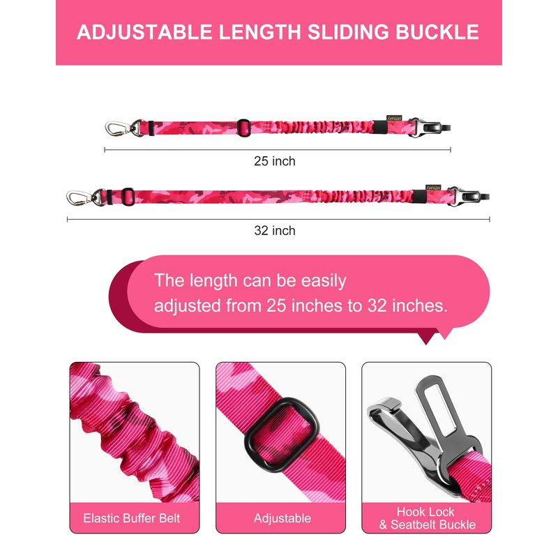 - ADJUSTABLE BUNGEE DOG CAR SEATBELT - The seat harness with elastic bungee buffer can prevent dogs from being injured during braking or sharp turns or bumps on the way. The length can be easily adjusted from 25'' to 32'' by sliding metal hardware, making your dog stand or sit down or lie down comfortably