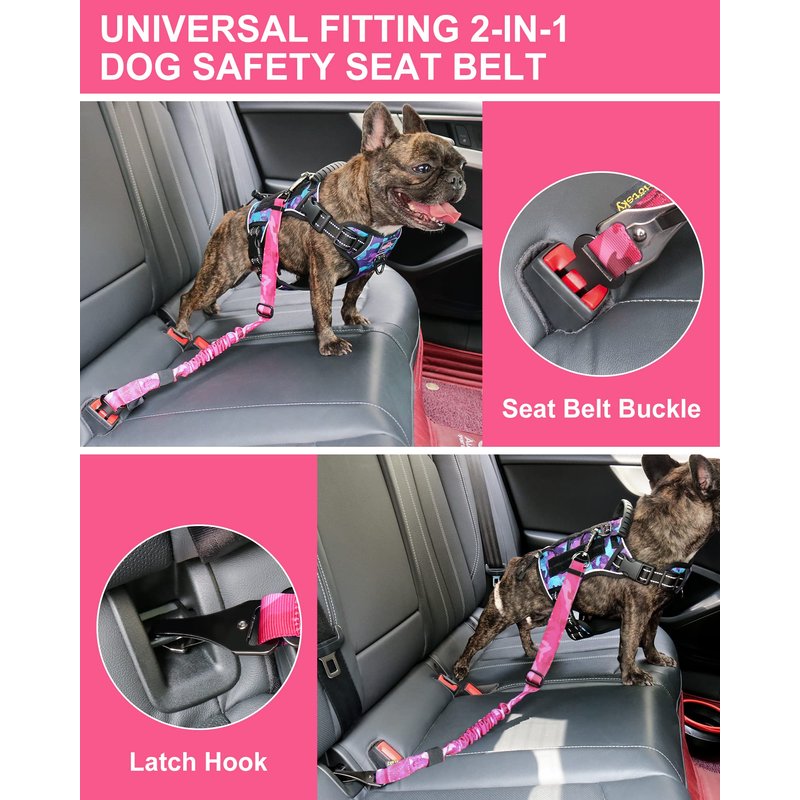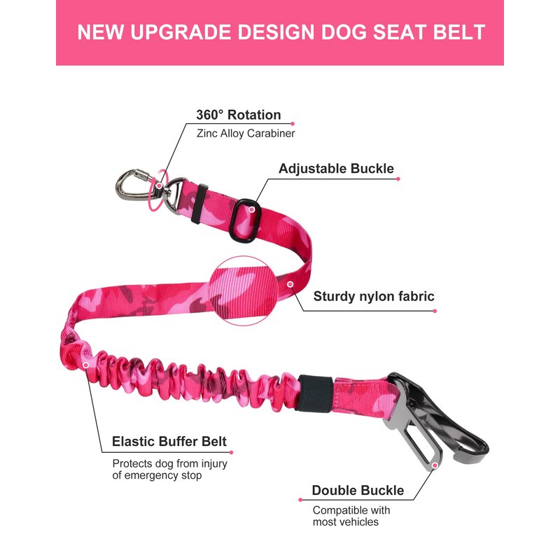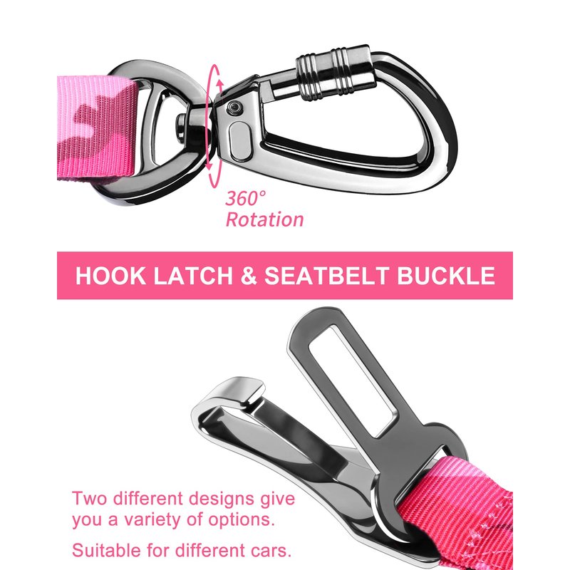 Hotsky Dog Seat Belt, Adjustable Safety Seatbelt 3-in-1 Car Harness for Dogs in Car Nylon Elastic Bungee Buffer Tether with Clip Hook Latch Buckle Swivel Zinc Alloy Carabiner(Hotpink Camo)