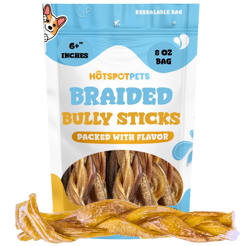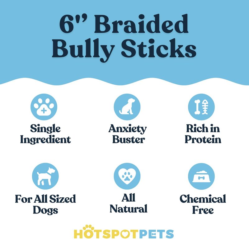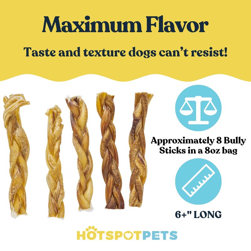 hotspot pets 6-Inch Braided Bully Sticks for Dogs – All-Natural, Long-Lasting Chews – Low Odor, Fully Digestible, High-Protein Treats – Rawhide-Free Dental Chews for Aggressive Chewers (8 Ounce)