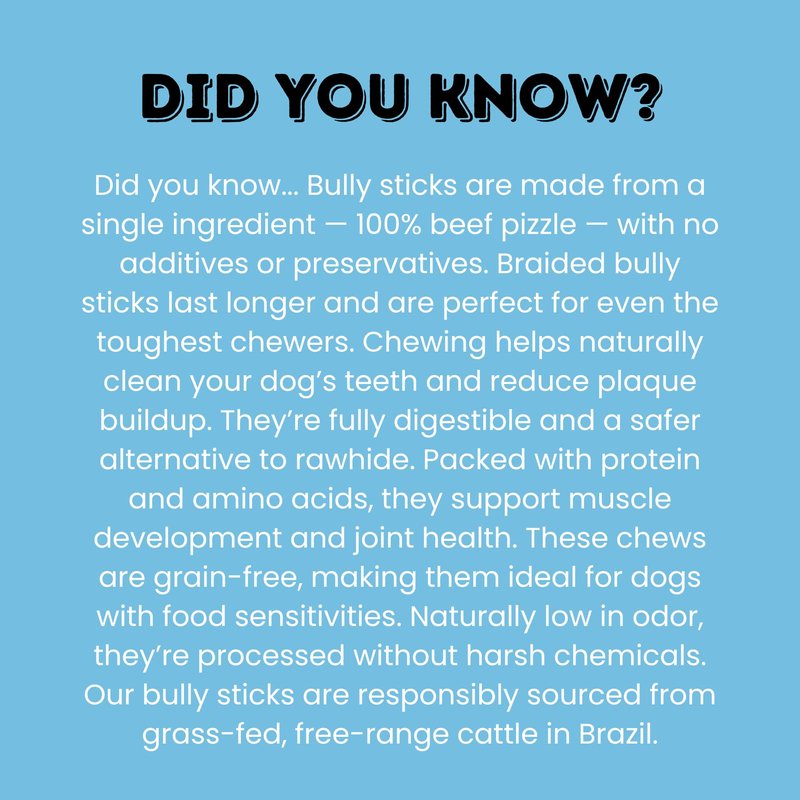 Give Your Dog the Natural Chew They Deserve – 6-Inch Braided Bully Sticks That Deliver Flavor, Durability & Peace of Mind Treat your pup to the ultimate chewing experience with our 6-Inch Braided Bully Sticks – the perfect combination of long-lasting durability, natural ingredients, and tail-wagging flavor. Crafted from 100% premium beef and expertly braided into a thick, satisfying chew, these all-natural bully sticks are ideal for medium to large dogs and aggressive chewers who need a little extra challenge. Each bully stick is carefully hand-braided to create a denser, longer-lasting chew that keeps your dog engaged and occupied for hours. Unlike standard sticks, our braided version provides a tougher texture that satisfies the natural urge to chew while helping clean teeth and strengthen jaws. It’s the perfect alternative to rawhide – completely digestible, protein-rich, and made without fillers, artificial flavors, or harmful chemicals. ✅ 100% Natural, Single-Ingredient Dog Treat Our braided bully sticks are made from one ingredient only: high-quality beef pizzle. No additives, no preservatives, no nonsense. Sourced from premium cattle and prepared with care, our chews offer a natural, wholesome treat that’s both delicious and healthy. You can feel confident knowing exactly what your dog is eating. Odor-Free & Clean Chewing We slow-roast each stick to naturally remove moisture and reduce odor, resulting in a low-smell chew that won’t leave your home with a lingering scent. While some natural variation in scent is normal, our odor-control process ensures a cleaner experience for both pets and pet parents. Fully Digestible & Rawhide-Free Say goodbye to dangerous rawhide chews. Our braided bully sticks are 100% digestible and safe for your dog’s stomach, making them a smart, healthy alternative that doesn’t compromise on toughness or satisfaction. Whether your dog is a light chewer or a heavy gnawer, these sticks provide the durability they crave without digestive risks. Naturally Supports Dental Health Regular chewing helps reduce plaque and tartar buildup, supports healthy gums, and promotes fresher breath. Our braided design offers more surface area to massage gums and clean teeth, all while keeping your pup happy and mentally stimulated. Perfect for Medium to Large Dogs & Power Chewers At 6 inches long and braided for added thickness, these sticks are ideal for medium to large breeds or dogs with strong jaws. Whether you're looking for a rewarding training treat, a boredom-busting chew, or a calming outlet for anxiety and teething, these sticks hit the mark.