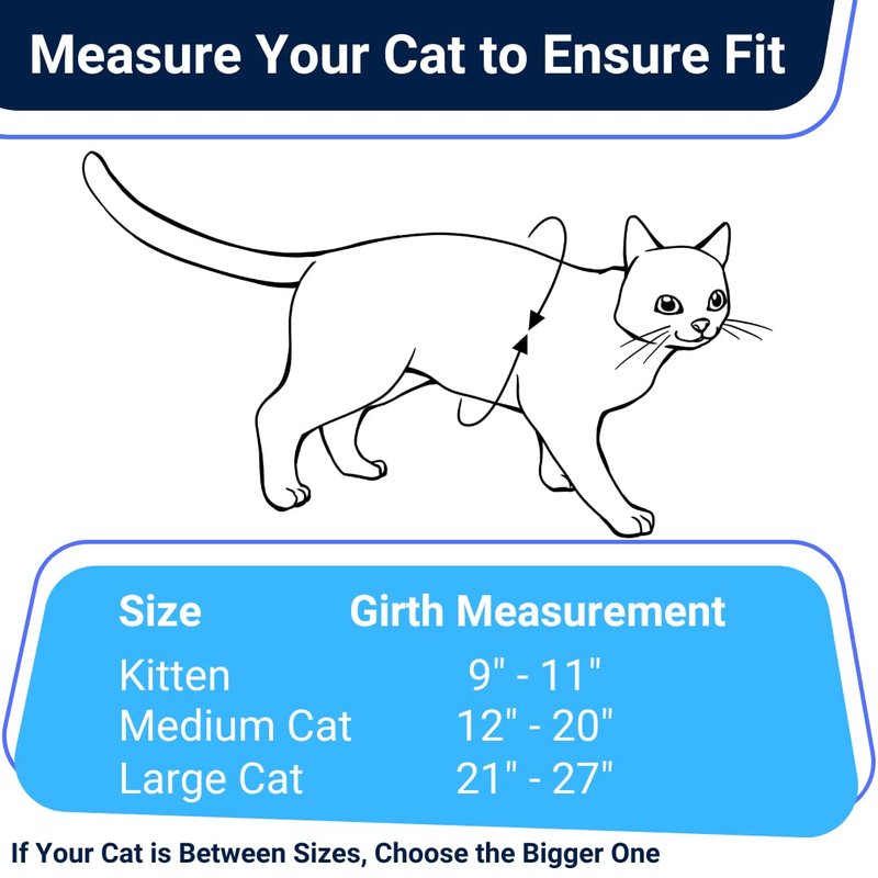 Escape-proof Cat Harness and Leash: The Houdini escape-resistant cat harness gives you gentle control when walking your cat on a leash. It's been designed to be escape-proof. - The kitten harness will gently provide a snug fit making it almost impossible to escape from. - It will also keep their neck safe thanks to the super-light chest mesh. - The adjustable straps will allow you to adapt it to your kitten as they grow. Important Note: Ensure maximum comfort and safety by measuring your cat before ordering: - Kitten 7 to 11 in. girth - Medium Cat 11 to 20in girth - Large Cat 21 to 27in girth.