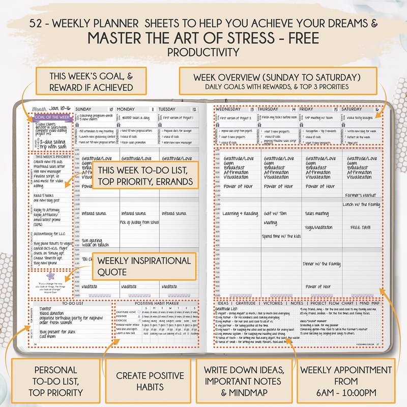 - 😃 INCREASE PRODUCTIVITY AND HAPPINESS - This is a deluxe life goal planner showing you how to become the best possible version of yourself on a mental, physical & interpersonal level using the law of attraction vibration guide. This 2024 planner is a daily planner, monthly planner, weekly planner, productivity planner, goal planner, business planner, to do list planner, planner notebook & gratitude journal all-in-one.