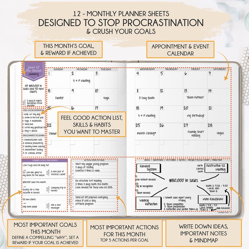 - 🏆 REDUCE OVERWHELM, STRESS AND FIX PROCRASTINATION - Follow a unique 8 step system that will help you bring back harmony, clarity, and peace in your life while achieving your goals. This planner 2024 is perfect for birthday gift, mother's day, anniversary gifts, and christmas gifts.