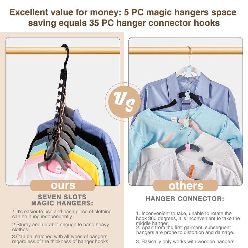 - Scientifically Designed Closet Organizer: The new magic clothes hanger has 7 grooves, The slot for the space-saving hanger is V-shaped, semi-closed for easy access to the hanger, and the hook won't fall out. We added a load bearing texture to the 2 sided hooks. Not easy to break, can be used with most clothes rod.