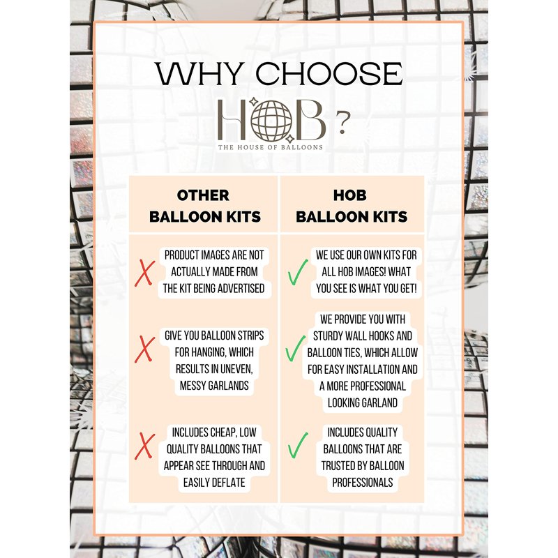 - 🪩 EASY AND AFFORDABLE🪩: Premium balloon garland kit created by a balloon artist! We know what it takes to create a great-looking balloon garland - flimsy hanging strips and thin, low-quality balloons are not it. You'll receive strong balloon hooks for hanging, balloons that are true to our marketing photos, and easy-to-follow instructions all at an affordable price.