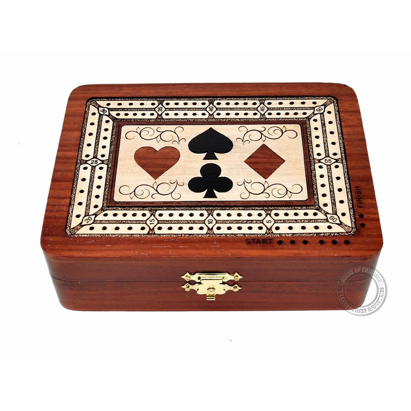 House of Cribbage presents exquisite 2 tracks (60 Points) Non Continuous Wooden Cribbage Board & Box in Folding version. The handmade cribbage board is made of Bloodwood and through special inlay process, Playing cards symbols (Suits) and Maple wood tracks are inlaid on the board with great precision.