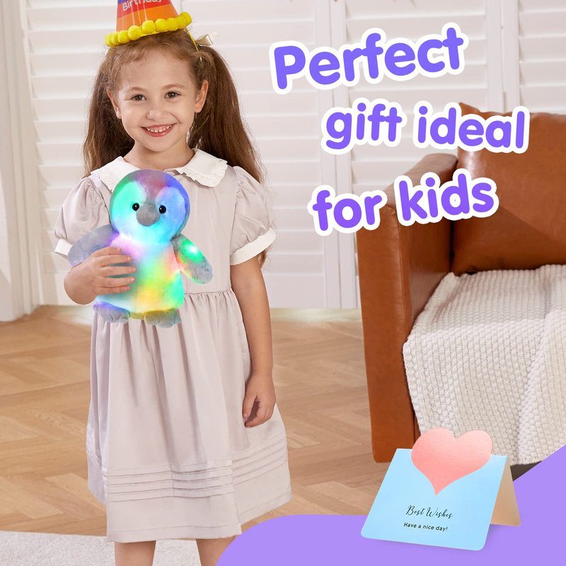 - NIGHT LIGHT COMPANION FOR KIDS AFRAID OF DARK: The LED lights give this penguin a beautiful glow, making it a great night light for your little one's room.Equipped with colorful LED lights inside, this cozy penguin plush toy will glow in the dark when turn on. Bring home this adorable 12'' LED light up penguin stuffed animal and watch your child's eyes light up with joy!