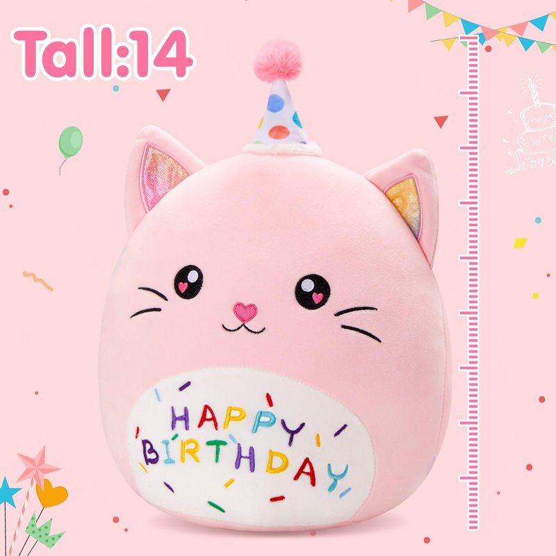 Houwsbaby 14" Pink Birthday Cat Plush Pillow Toy,Creative Cat Stuffed Animal,Super Squishy Cute Cat Shaped Birthday Gift, Party Decoration for Kids and Adults