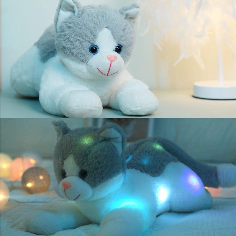 - GLOW IN THE DARK:The cute light up stuffed cat features a wonderful function of glowing in the dark, press the button on the left paw of the kitty plush, it will glow. The lights are the same color at the first few seconds, and they will change to colorful after that. It should be a good companion at bedtime, especially for those who are afraid of dark.