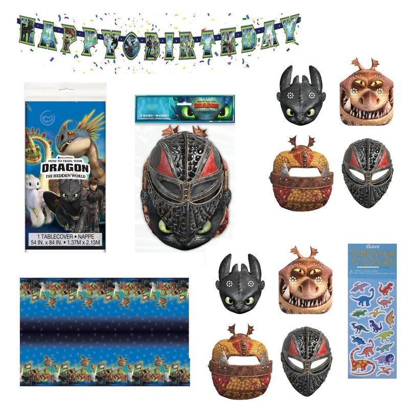 How to Train Your Dragon Birthday Party Decoration Set includes 1 Happy Birthday Banner, 1 Table Cover, 8 Paper Masks, 1 Dinosaur Sticker Sheet (not Dragon stickers).