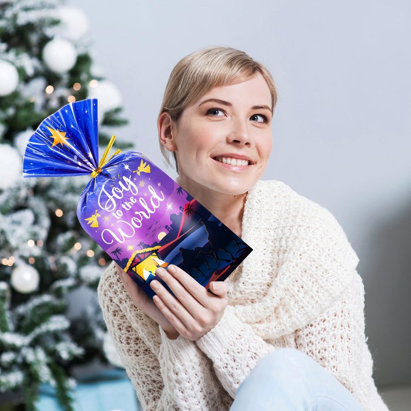 - Faithful Greetings and Holy Nativity Design: Christian Christmas Cellophane Bags featuring a Holy Nativity Scene and captures the essence of the Christmas story, with images of Jesus, Mary, Joseph, the manger, Angel, Advent Wreath, Christmas Carols and Hymns, Midnight Mass, Christmas Eve Candlelight Services, Christmas tree, Three Wise Men, Christmas Star, Peace, Hope, Love, printed with “Merry Christmas”, “Joy to the world”, “O Holy Night”, “Jesus is the reason for the season”, interesting way for Xmas party gifting!