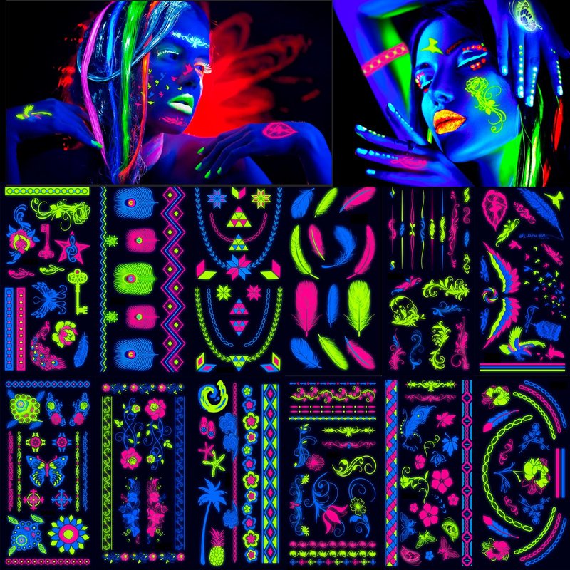 - Body Decoration for Every Occasion: Blacklight reactive light face flash fake tattoo neon UV glow tattoos are perfect for Halloween makeup, parties, clubs, carnivals, weddings, dances, festivals, nights out, or anywhere with UV lighting, making you shine in the crowd!