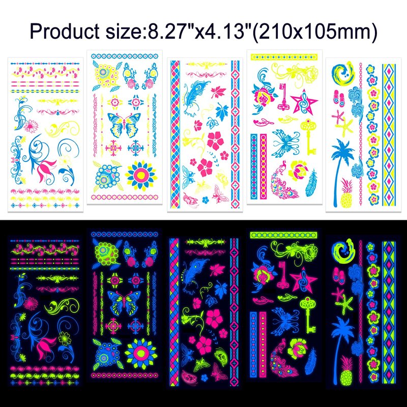 - Blacklight Face Flash Fake Tattoos Include: You will receive 12 sheets Neon tattoos stickers for women with 12 different patterns. Neon butterfly feathers temporary Tattoos will need a few minutes of activation by light before they will glow in the dark.