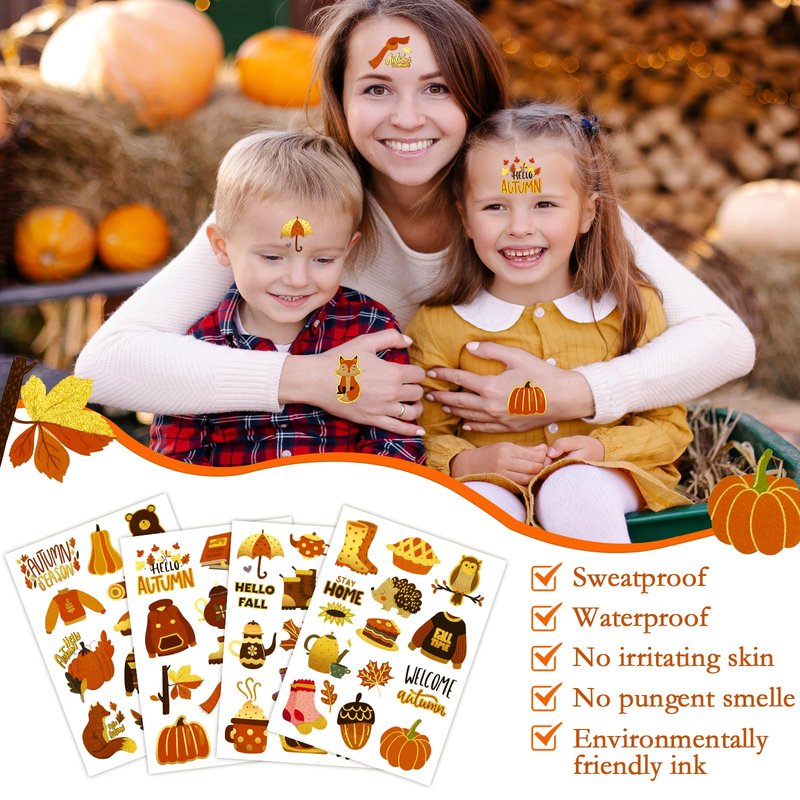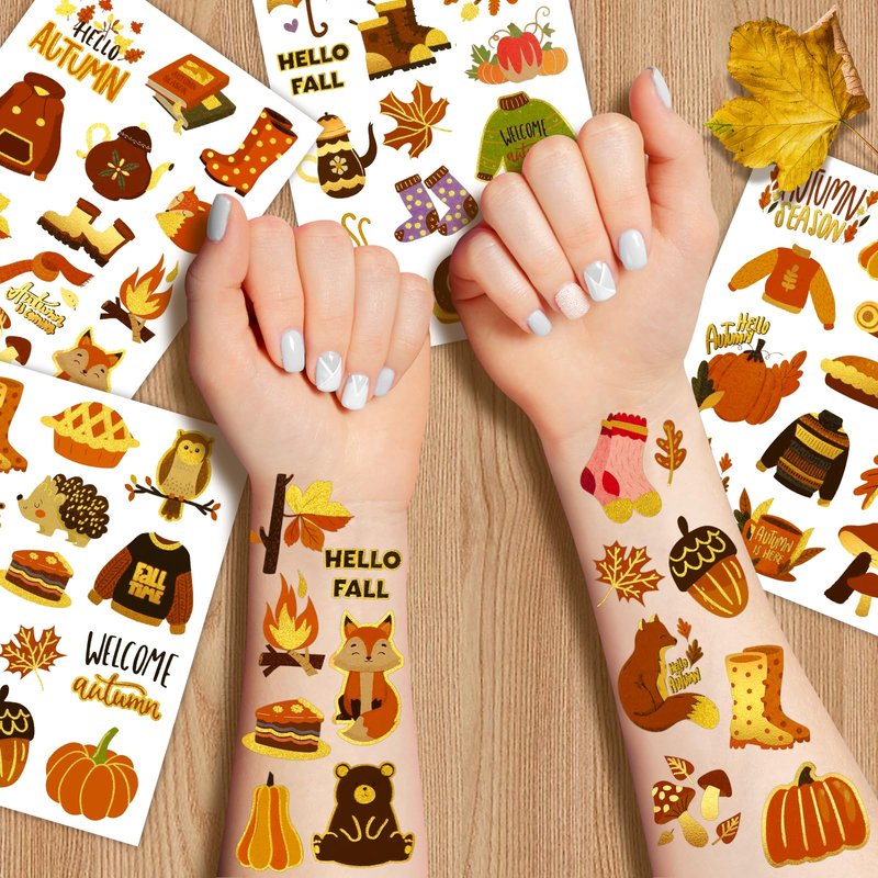 - Perfect Welcome Fall Party Accessories: Autumn Temporary Tattoos Stickers for Fall Thanksgiving themed party supplies are popular gift for Fall party! Not only perfect for Thanksgiving day party, fall themed party, autumn themed party, and other give thanks events, but also suitable for family gatherings, costume parties, birthday parties, you can have an unforgettable autumn!