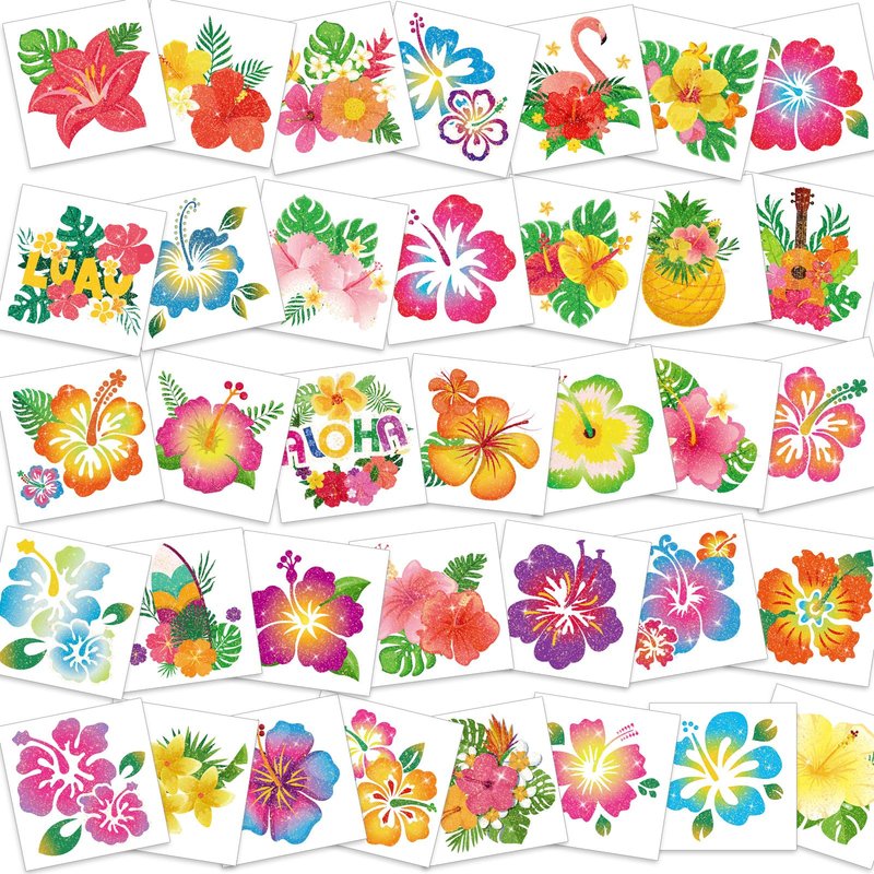 - ALOHA! Summer season is here! Let’s go to the beach and pool now! Apply the glitter Hibiscus Glitter Sticker Tattoo Temporary Tattoo on skin to have a HOT summer look! You will receive 72pcs Hibiscus Flower temporary tattoos, design with multi colors and different attractive shape Hawaiian Tropical Flowers, full of beach party atmosphere, Hawaii themed party styles, share with families and friends and have an elegant look on beach!