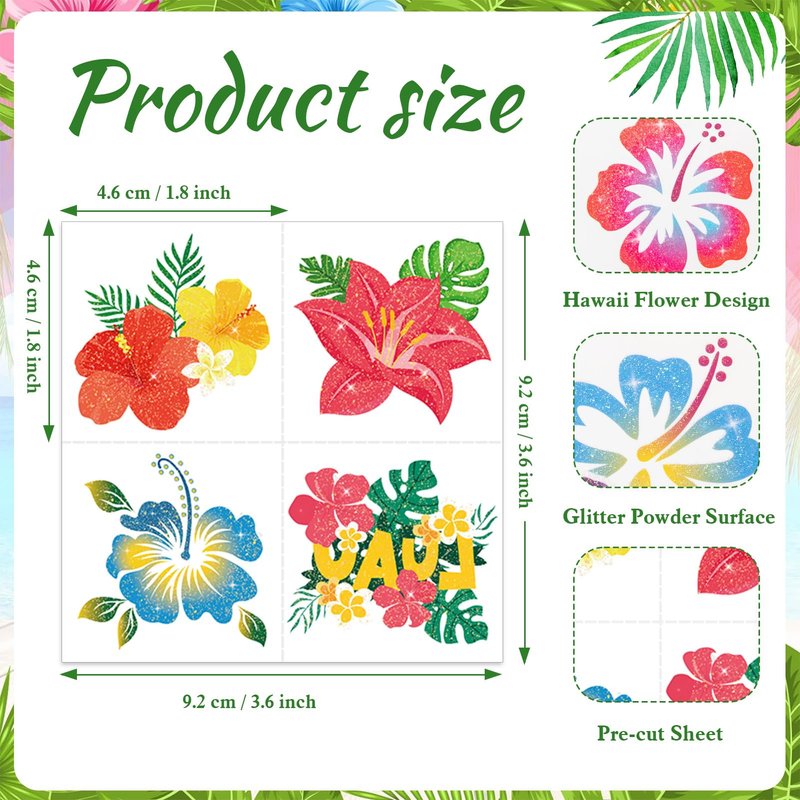 - Perfect Hawaii Party Decoration and Summer Party Accessories: Vibrant color and vivid design of Summer Flower Tattoo Sticker look exquisite, shine glitter powder surface, nice quality, our Hawaiian tattoos temporary will shine under the sun and light with a beautiful appearance! Hibiscus temporary tattoos can be applied on chest, face, shoulder, waist, sleeve, back, leg, arm, chest, hand, feet, neck and any other part of your body to show your femininity, grace, and beauty.