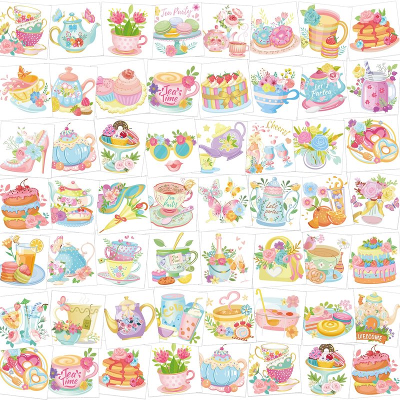 - 48 Designs 96pcs Individual Tea Party Themed Temporary Tattoos: You will receive 96 pieces Tea Party fake tattoos with 48 styles design, Tea tattoos cover a variety of cute stuff regarding tea pot, tea cup, and some vintage accessories that boost the wealth and blessings given to each person at tea party!