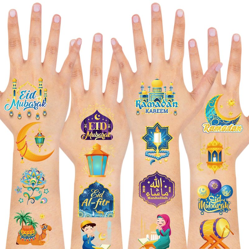 - Bring Endless Fun on Ramadan Party: Apply this Ramadan themed tattoos on your chest, face, shoulder, waist, sleeve, back, leg, arm, chest, hand, feet, neck and any other part of your body to welcome the Ramadan Mubarak! Mubarak tattoos stickers also can used to decorate windows and other, increase the Eid Mubarak party celebrating atmosphere!