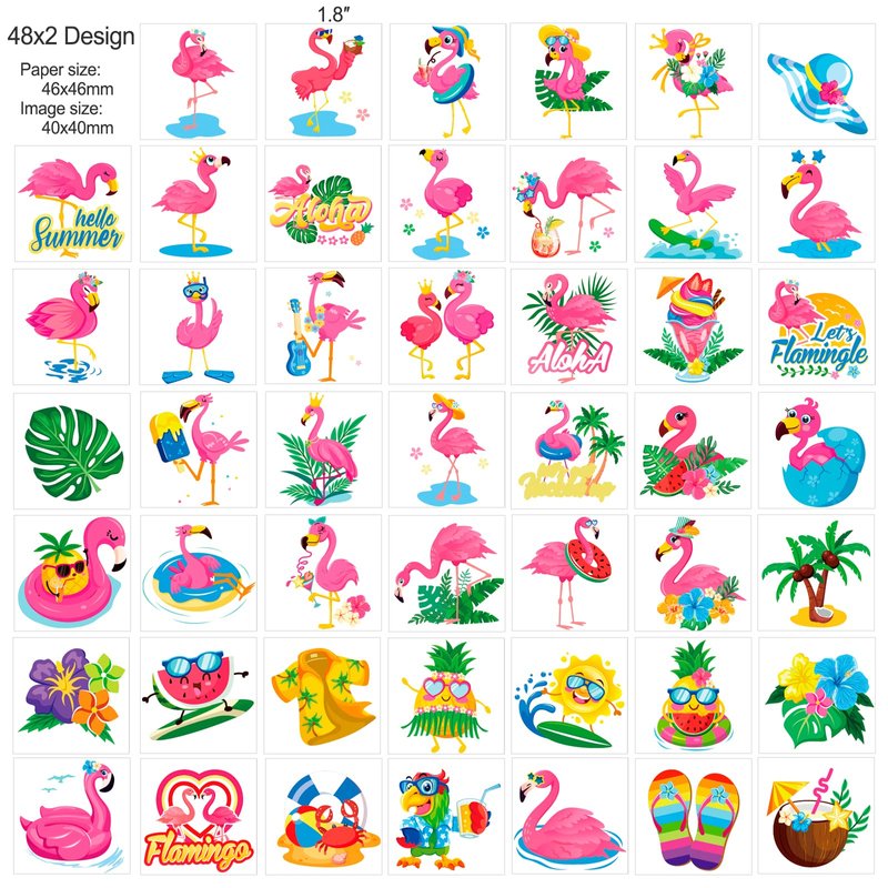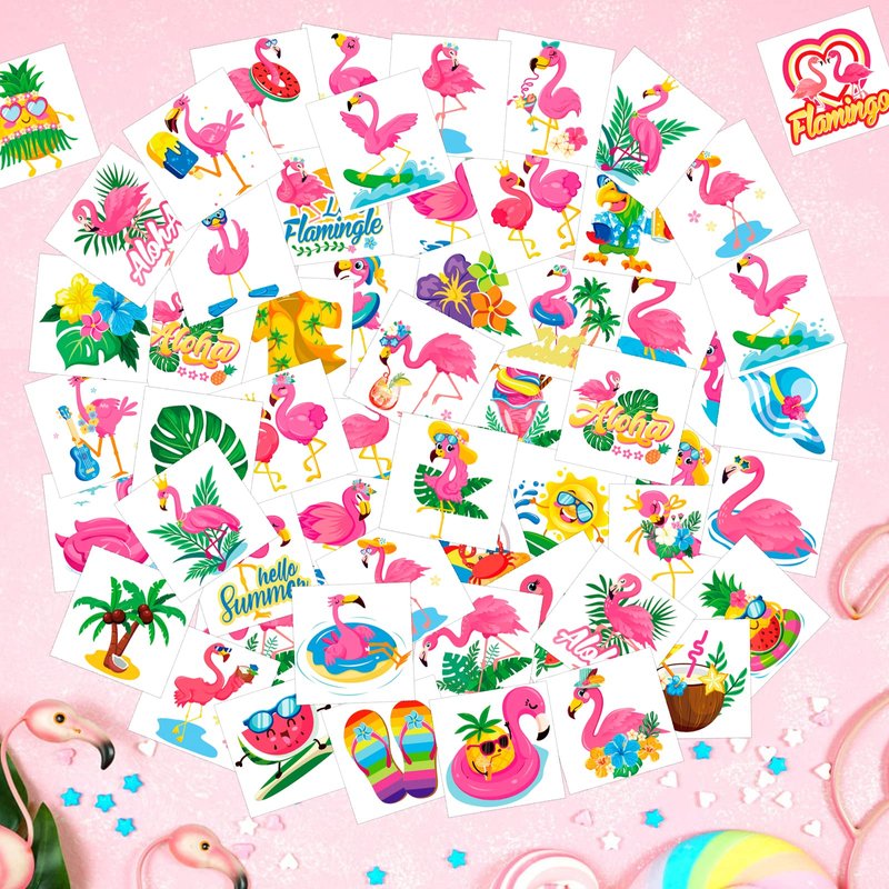- Tropical Party Flamingo Tattoos Set: Let's Flamingo! Let’s get flock up! Package include 96pcs flamingo temporary tattoos design into 48different patterns, perfect flamingo party supplies or summer party accessories, flamingo styles fake tattoos for kids add summer style for your summer party decoration!