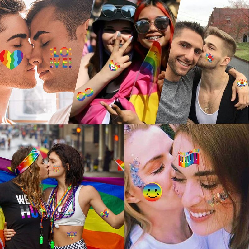 - Gay Pride Rainbow Temporary Tattoos - You will get 96pcs waterproof LGBT gay pride rainbow temporary tattoos for women men and kids, in 48 different designs, match it with Rainbow Fan Brush Face Paint, rainbow flag or other rainbow fancy dress, which are perfect suitable for Gay Pride Celebrations coming !