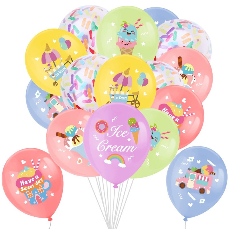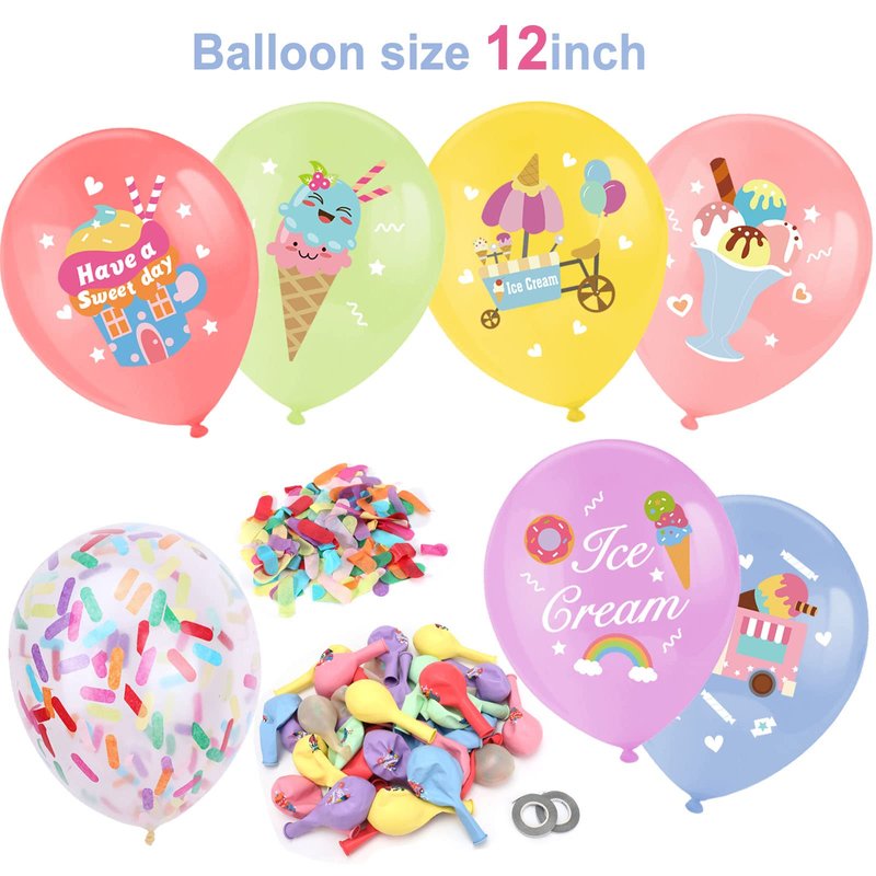 - 【Easy Usage】Confetti balloons candy-colored balloons are Pre-filled with confetti and clear printed. Just inflate the balloon with helium tank or air pump, Then tie the balloon with ribbon, easy to hang both outdoors and indoors. 12 inches colorful ice cream balloons combine together to leave creaty sweet and dreamy memory for all guest!