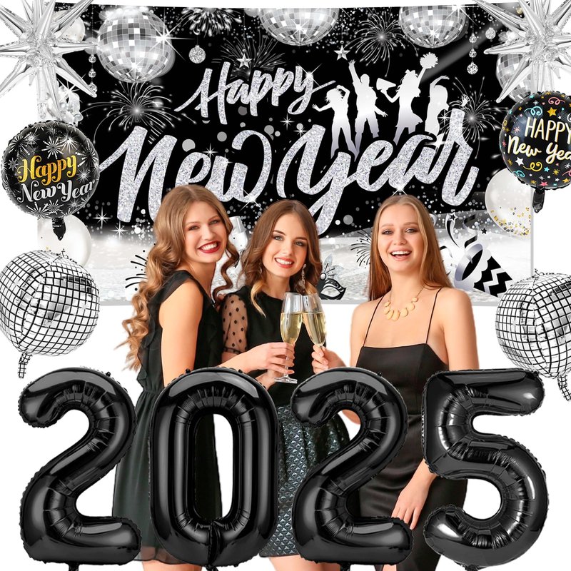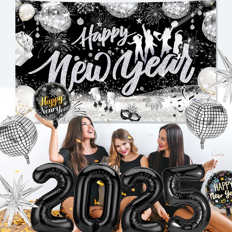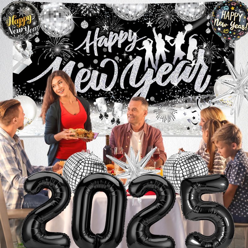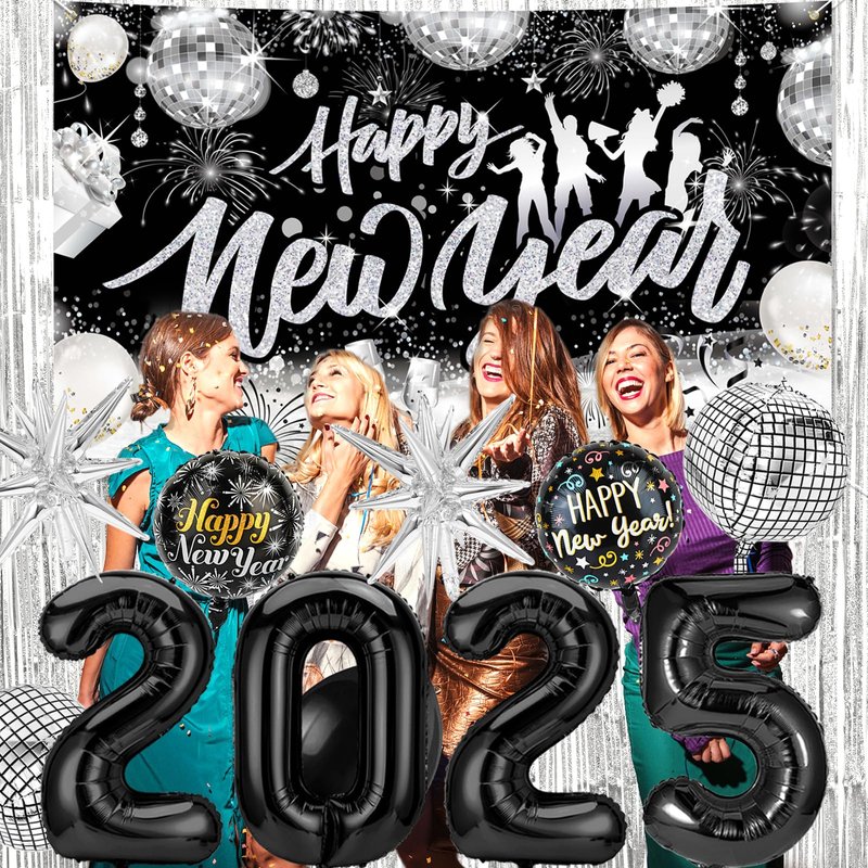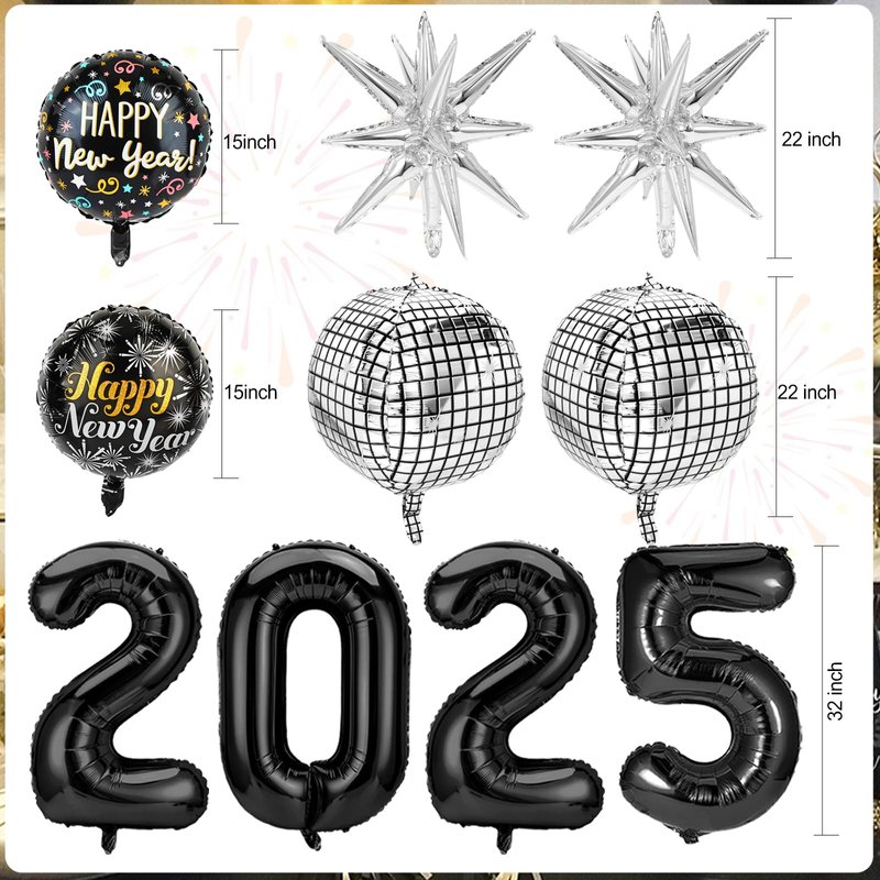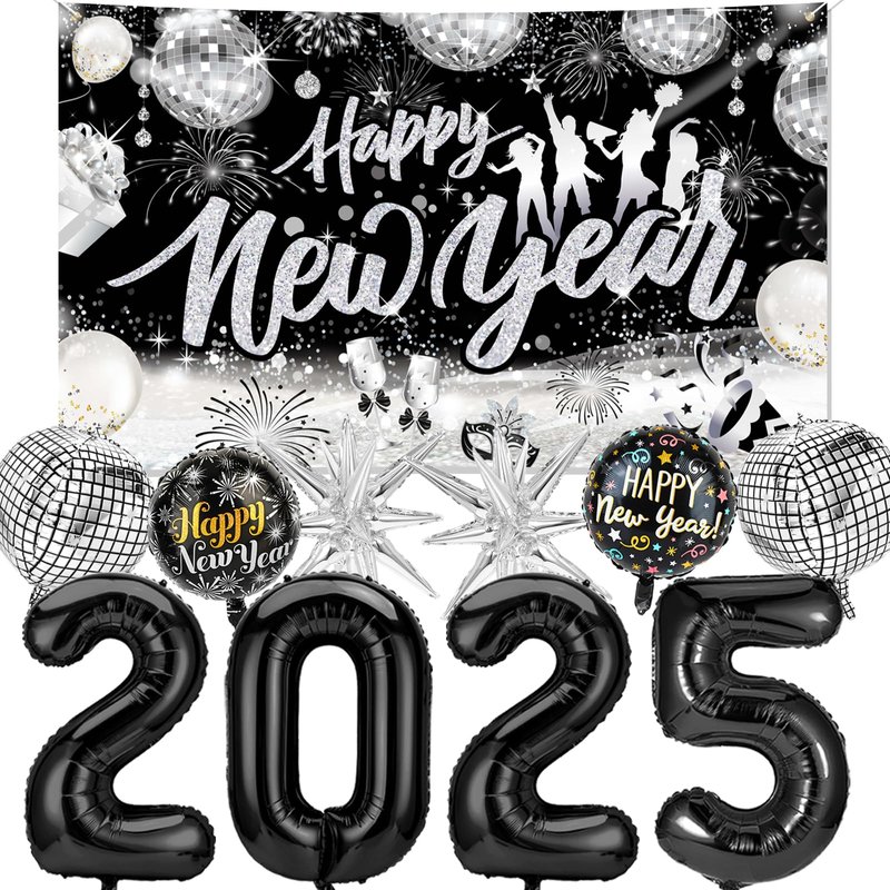 - 【Black Silver Disco New Years Decorations】1* Festive Silver Happy New Year backdrop banner, 2*silver disco ball foil balloons, 2*silver star foil balloons, 2*Happy New Year round foil balloons, 1* black color Number 2025 foil balloons, perfect as new year party photo background, come along with a 6m long ribbon, easy to hang on through the copper grommet! Happy New Year 2025 decorations banner 2025 new year balloons set can be hang on home, office, garden tree branch or front door as welcome sign, convenient to decorate a festive new year party, perfect new years decorations accessories!