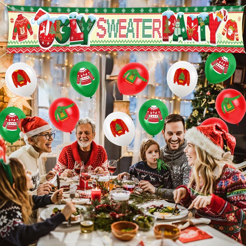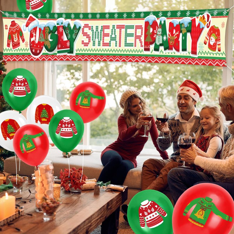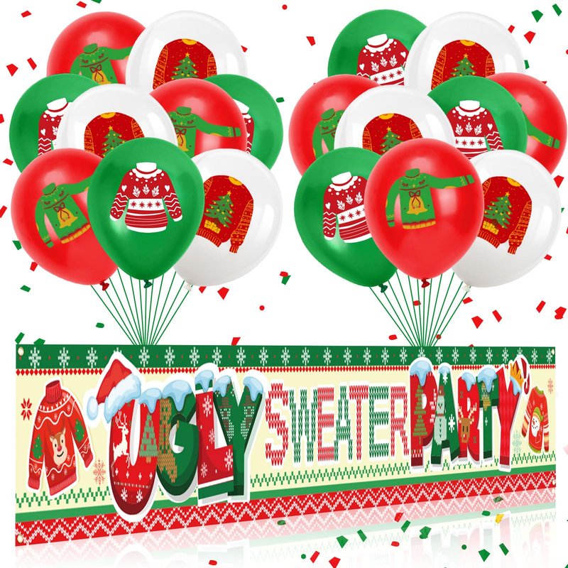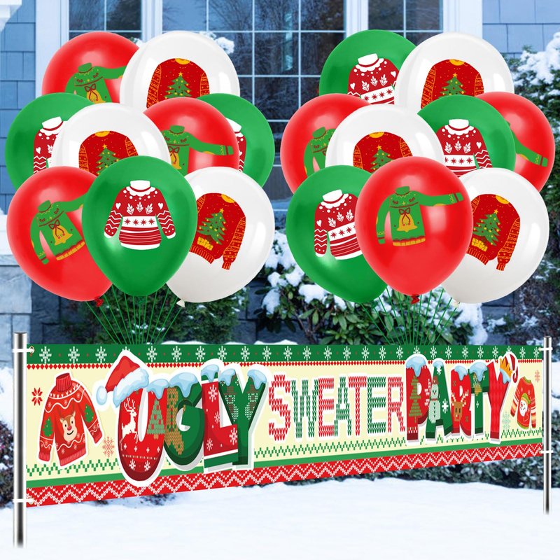- Convenient Ugly Sweater Party Supplies: Ugly Sweater Christmas banner with balloons set comes along with 6m long ribbon. We've paired the Ugly Sweater Party banner with balloons in the same theme, you don't need additional balloons with decorations, so this decorating set will make dressing up for a party quick and easy!