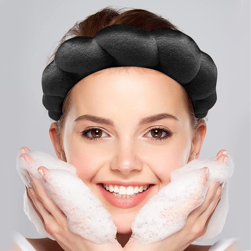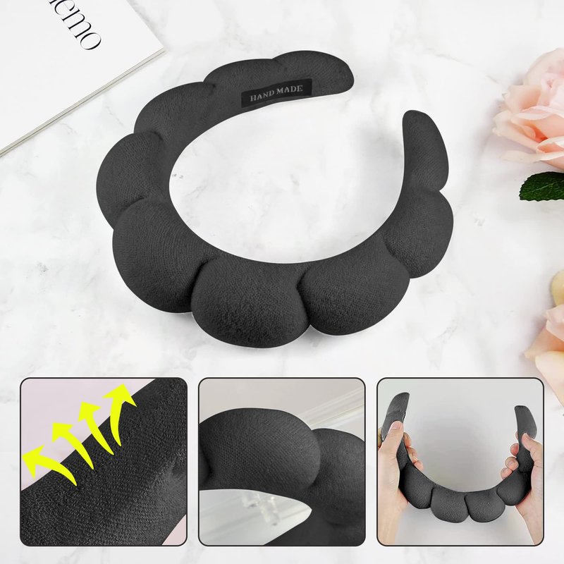 HOYDATE Puffy Spa Headband for Women Padded Soft Hairband Non Slip Sponge Headband Sponge & Terry Towel Hair Band for Face Washing, Makeup Removal, Shower, Skincare,Yoga(Black)