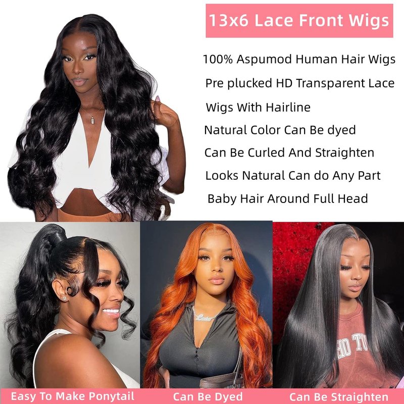 - 13x6 Lace Front Wigs Human Hair Quality: Body Wave Lace Front Wigs Human Hair 180% Density, 12A Grade. HD Transparent Lace Frontal Human Hair Wigs for Women with Baby Hair Glueless Wigs Human Hair Pre Plucked. It Can Be Straightened, Curled, Bleached, Dyed, Permed, Durable, Reusable And Styled As Your Own Hair.