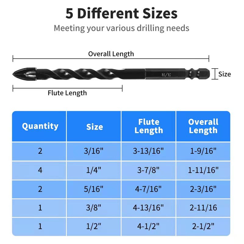 - 【Sizes of Masonry Drill Bits】Includes these: 2 * 3/16" (4.7mm), 4 * 1/4" (6.3mm), 2 * 5/16"(8mm), 3/8" (9.5mm), 1/2" (12.7mm). Easily meet your drill needs