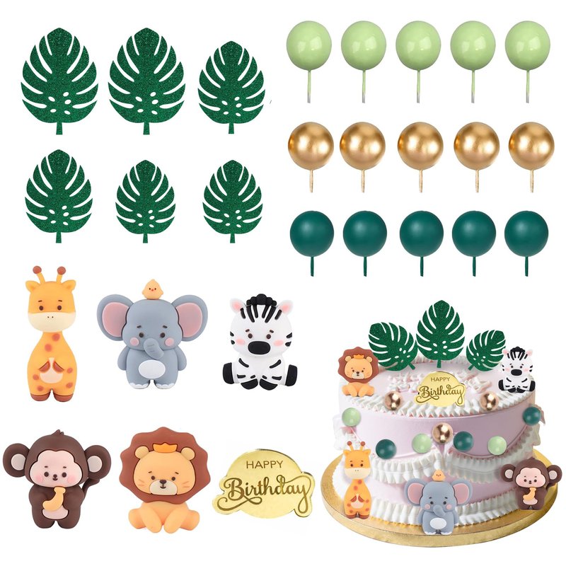 - Variety of Animals Included: Each set includes 5 safari animals, such as lion, elephant, giraffe, monkey and zebra. Also included are 15 decorative balls, 6 turtle plam leaves and a happy birthday cake decoration and provide rich decorations for your birthday cake.