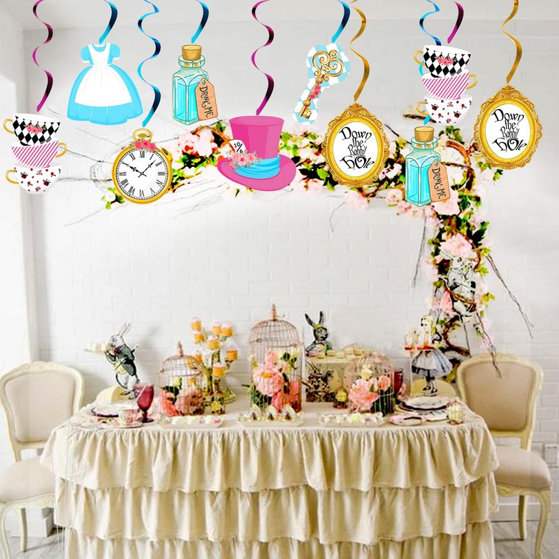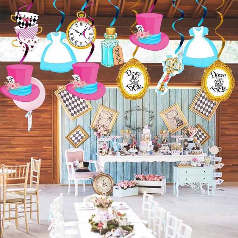 - ALICE IN WONDERLAND – Are you in love with the magic of Alice in Wonderland? You can’t miss our set. This beautiful Wonderland party hanging swirl decorations could bring a touch of wonderland to this big day. This dreamy party is going to be memorable and impressive.