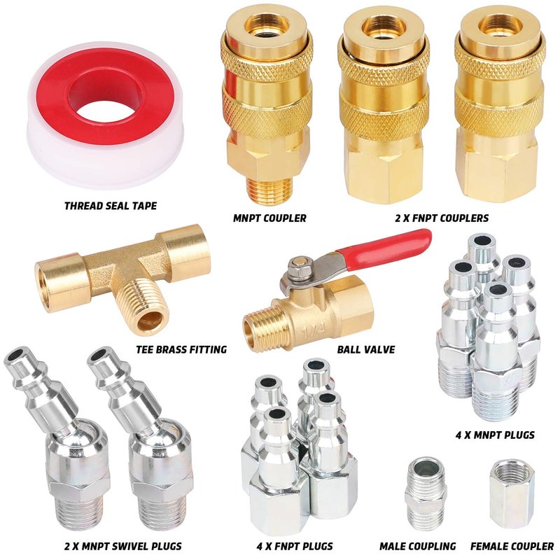 Hromee 18-Piece air compressor accessories kit standard Industrial pneumatic air coupler quick connects. Here's everything you need to connect air tools and control air flow with compressed air. This kit includes brass ball valve, tee pipe fitting, air coupler and plug that has all the most commonly used air compressor accessory items in one set. All the outside thread need use thread seal tape.