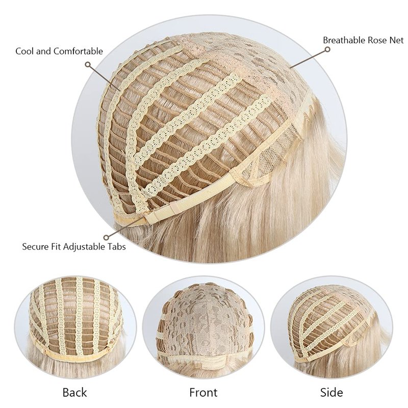 Material and mesh cap: This wig is made of flame retardant lowtemperature synthetic fiber. You can't use electric splints and electric rollers to shape your hairstyle again.You can trim your bangs as long as you like. This bob wig mesh cap is designed with 8 adjustable buckles, suitable for all women with a head circumference of 21.5-22.25 inches.