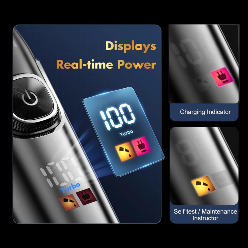 - 2. ADJUSTABLE SPEEDS & LED DIGITAL DISPLAY: Our hair clippers feature a turbo acceleration function, adjustable to 2 speeds to cater to different haircut needs. Rotation speed can reach 6500 / 7500 rpm. An in-built LED screen displays charging status, remaining power, and a lubrication reminder, ensuring a superior clipping experience.