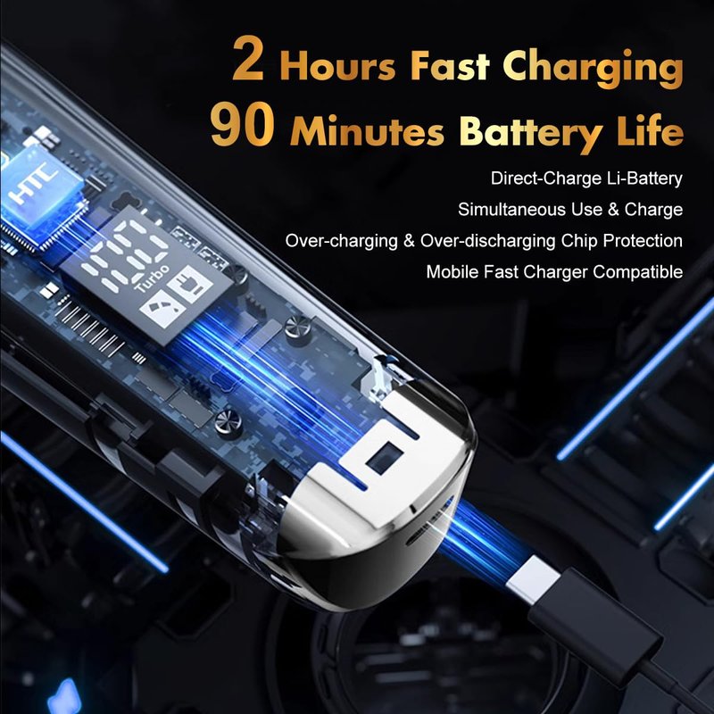 -- USB fast charging, 2 hours charge for 1.5 hours cordless use.